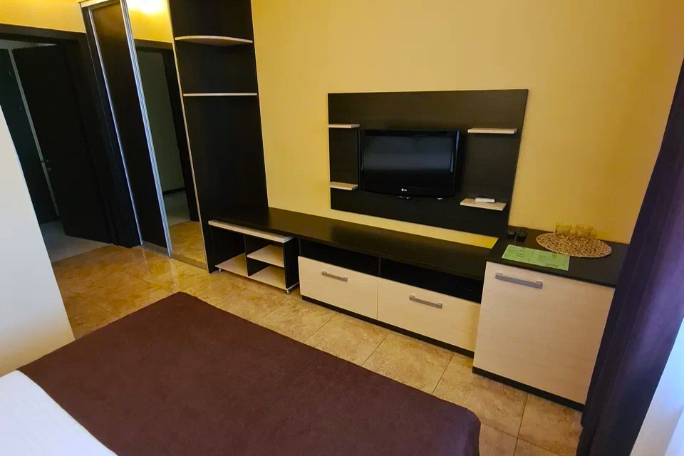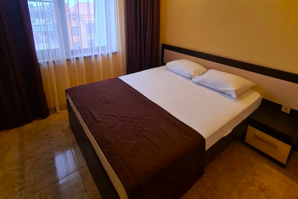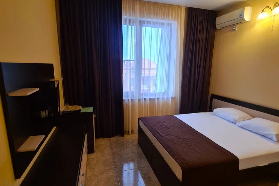 «Евростандарт двухместный» - удобные номера с одной двуспальной или двумя полуторными кроватями, прикроватными тумбочками, шкафом для одежды, индивидуальной системой кондиционирования, телевизором, холодильником, санузлом.